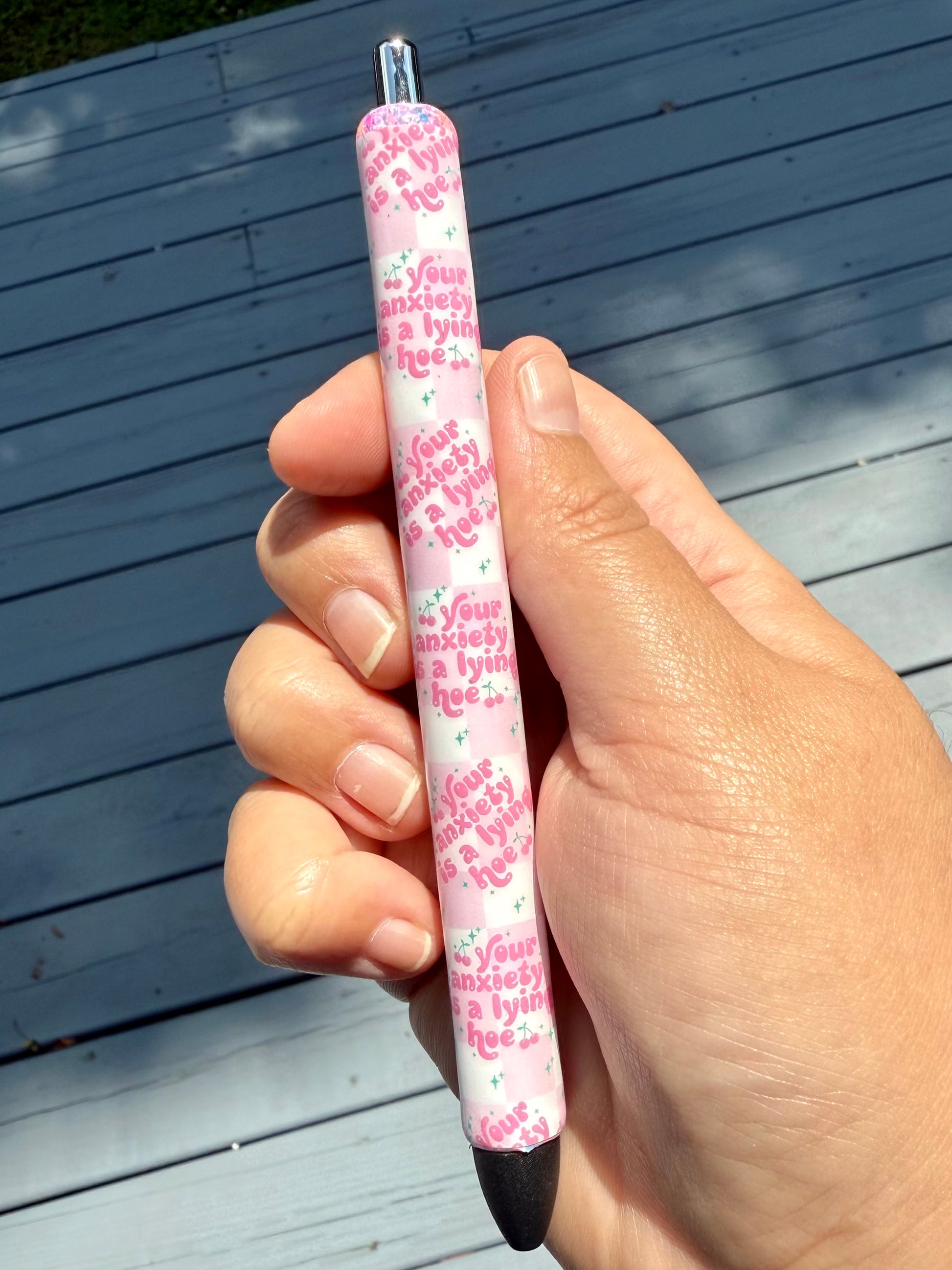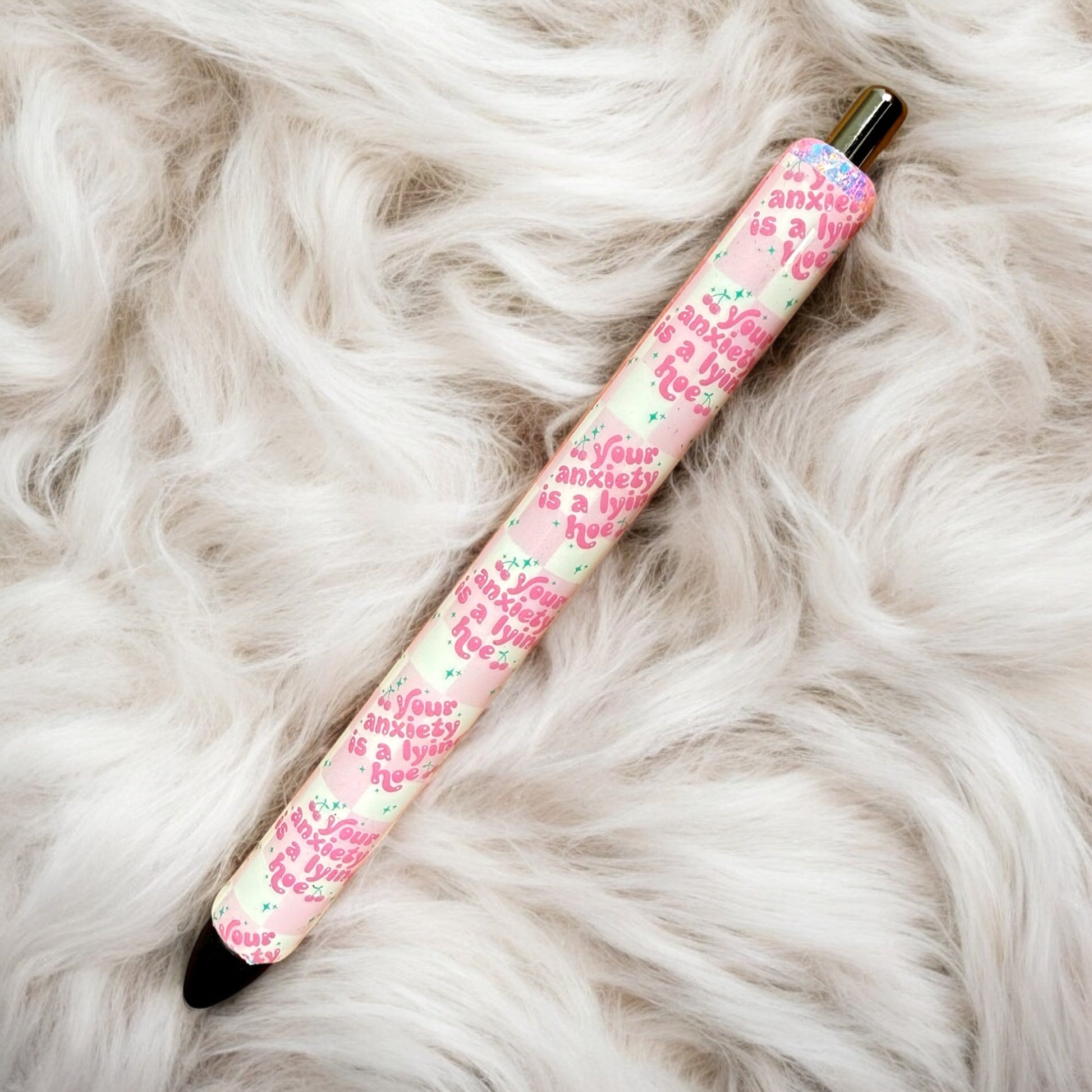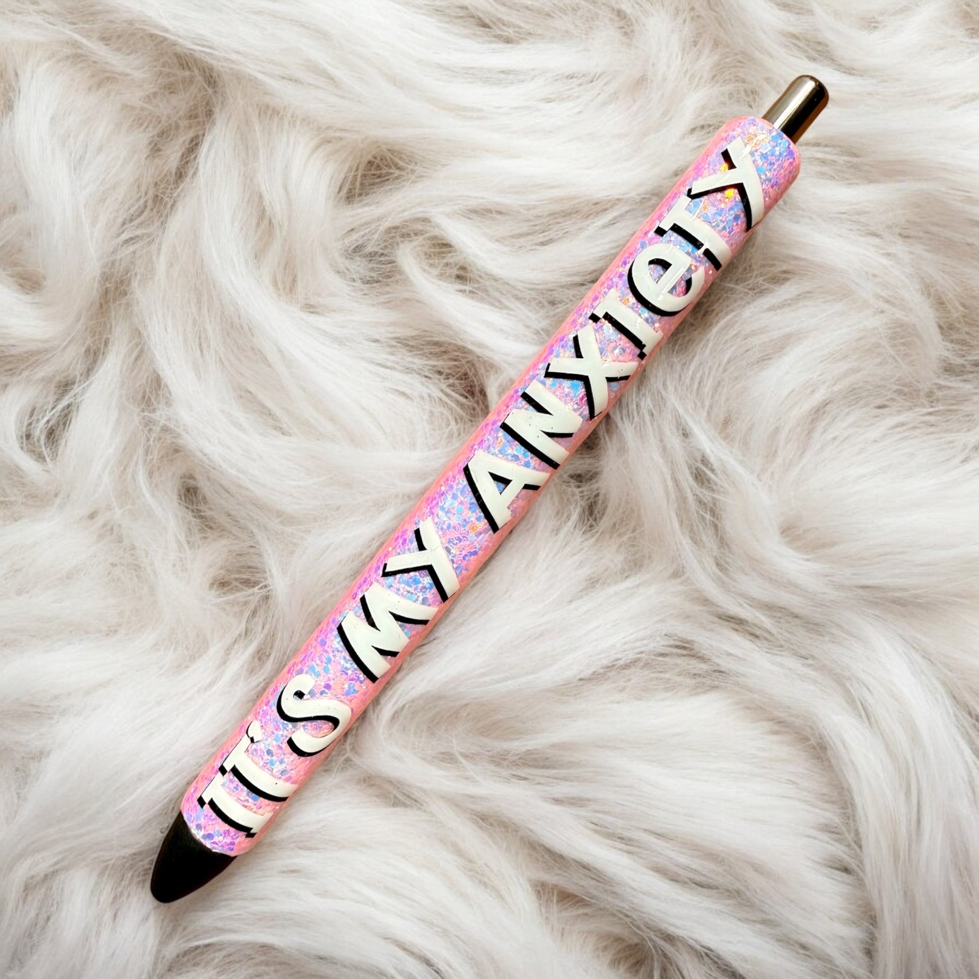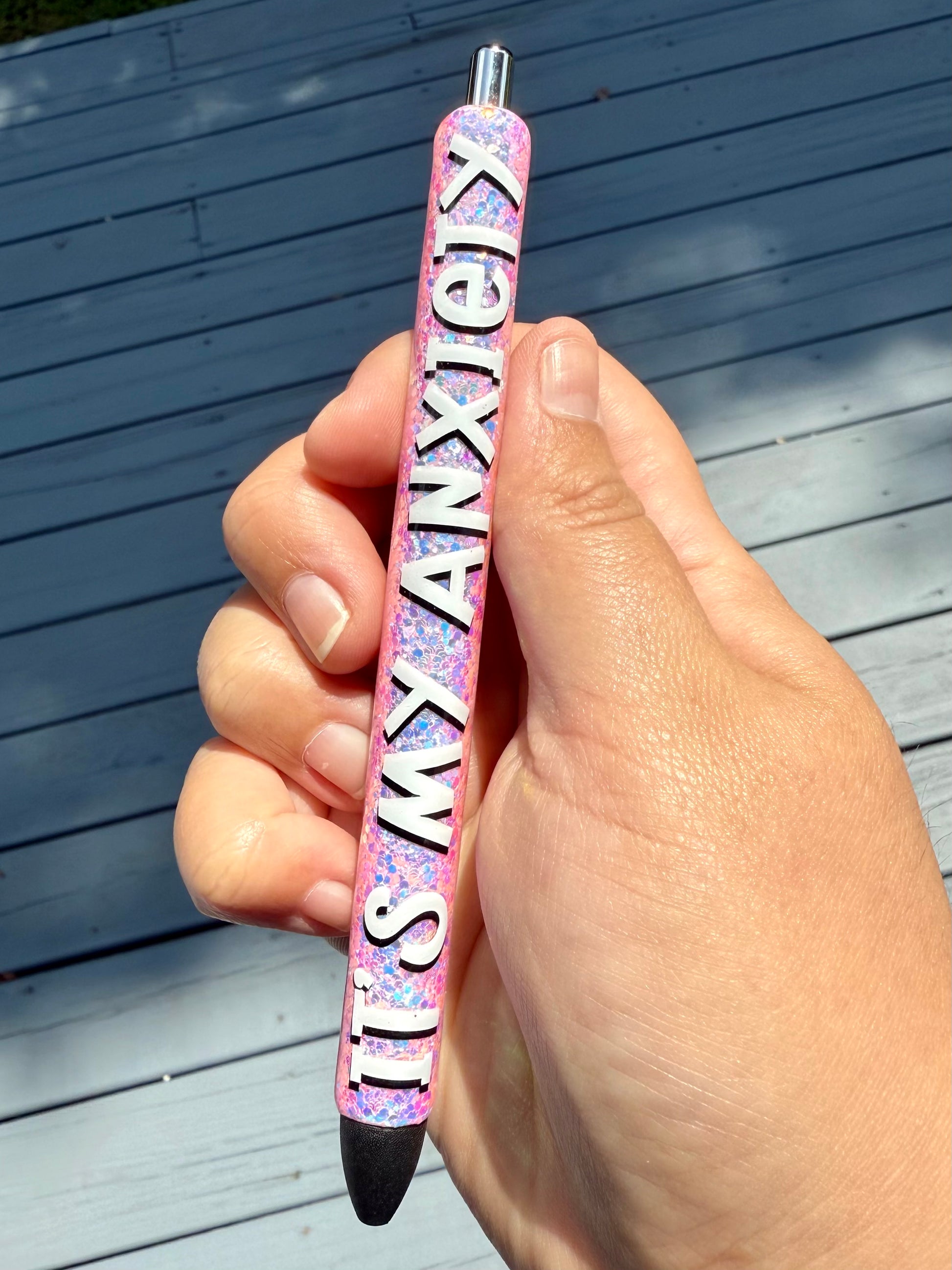 All pens are handmade by me! Due to this being a handmade item, imperfections, blemishes, or bumps may be present. I do try to make sure every item is up to perfection before shipping. Pens are Paper Mate Ink Joy 0.7mm Gel Pens. 1 black refill is included. All pens are made with high quality glitters, vinyl, and UV resin.